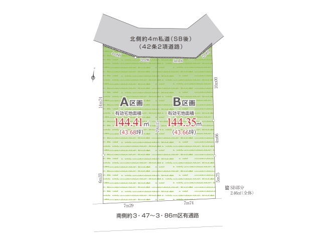 北側約4m私道(SB後)(42条2項道路)、南側約3.47~3.86m区有通路(建築基準法外)