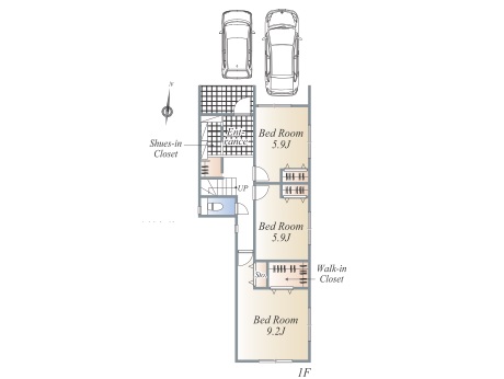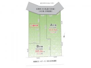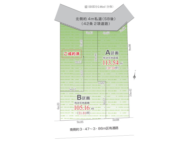 北側約4m私道(SB後)(42条2項道路)、南側約3.47~3.86m区有通路(建築基準法外)